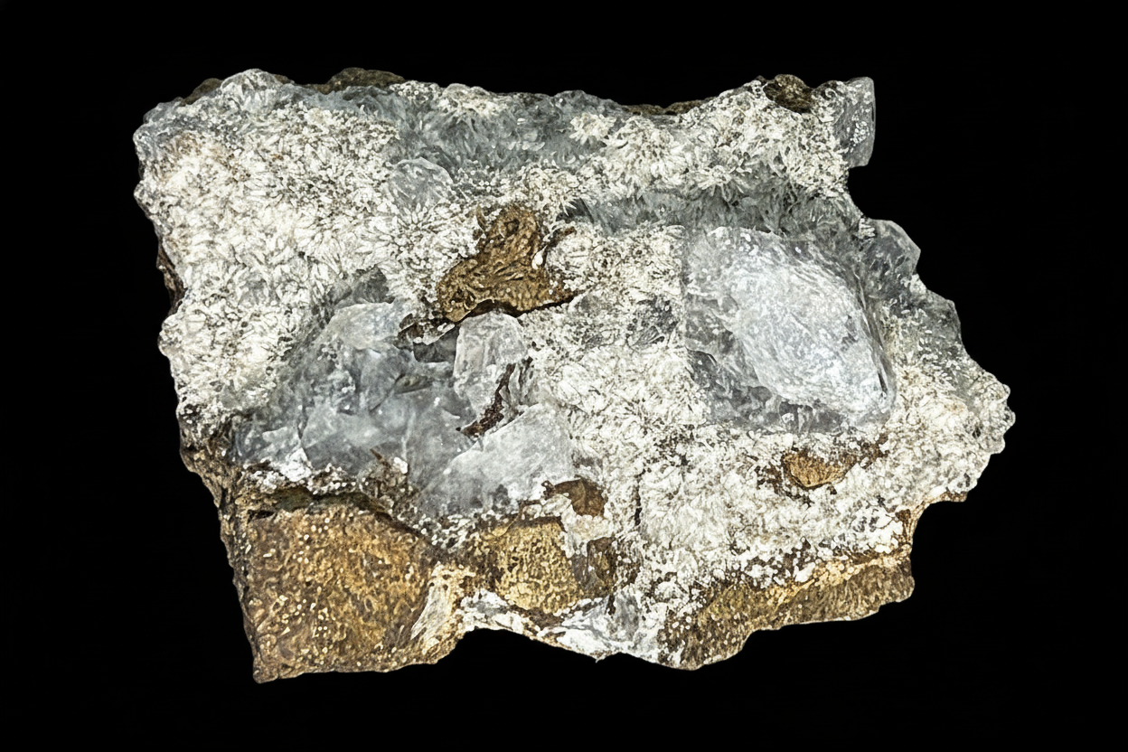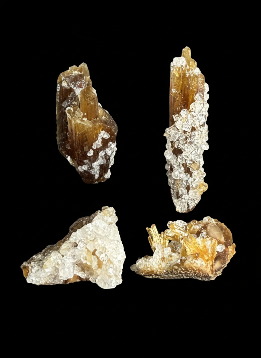 Price $30 Four specimens in the one box. Orange calcite that fluoresces white with a green afterglow. Colourless chabazite (phacolite habit) crystals are sprinkled along the calcites. Boxed…