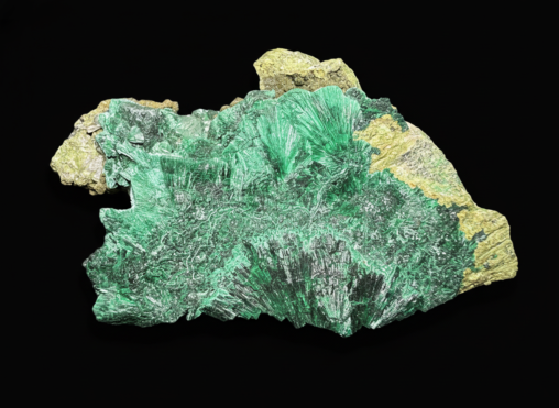 Price: $150 Compact fibrous green malachite pseudomorphing azurite, with small crystals of cerussite, and olive green duftite or mottramite. Measures 85x60x18mm. Ex Roger Lang.