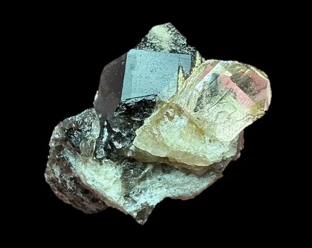 Description: A sharp black smoky quartz with a pale-coloured lustrous topaz crystal on matrix. Specimen measures 40x25x22mm.
