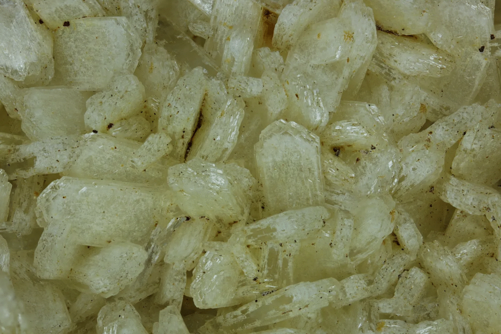 Description: Crystals of stilbite (likely stilbite-Ca) with complex terminations. The underlying calcite fluoresces pink under longwave. Se Mineral Matters #741 for information about the locality. Specimen is permanently mounted in a micro box. Close up photo width is 9mm.