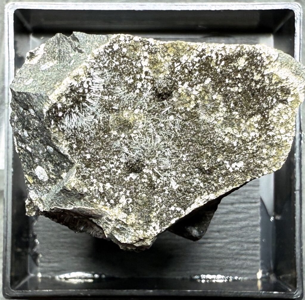 Prismatic natrolite with tiny phillipsite crystals and brownish-black nontronite (as labelled). Boxed Thumbnail. Ex Brian Davis Collection. Ex Frank Robinson (2007). Ex Joan Lamond (1991).