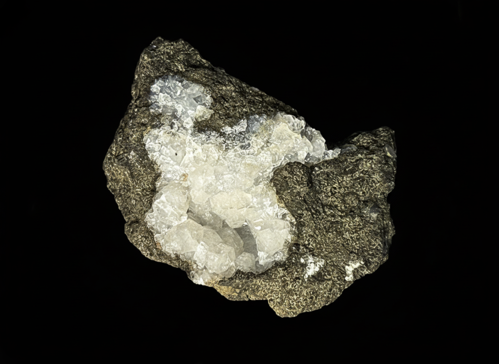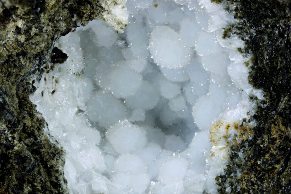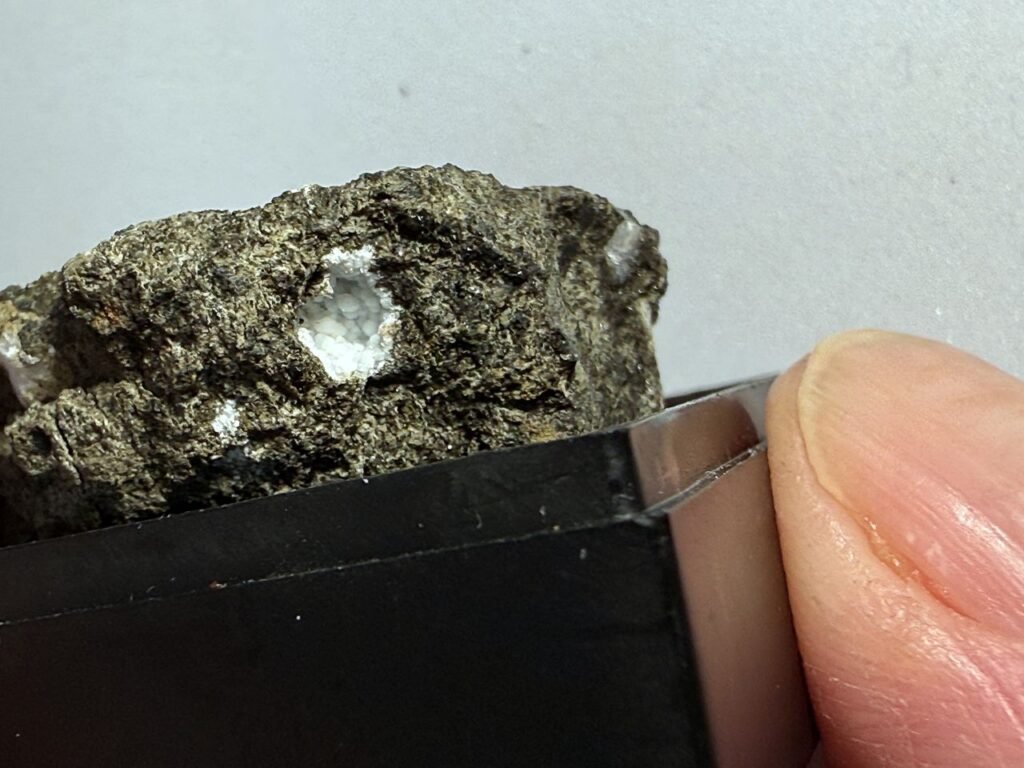 The main vugh is lined with phillipsite. There is a small vugh lined with silky crystals of the rare zeolite cowlesite. Near the bottom of the specimen is a vugh with levyne and erionite. Close up photo of the cowlesite is ~6mm. Boxed Thumbnail. Ex Brian Davis Collection. Ex Frank Robinson (2007). Frank Robinson Cat No 395.