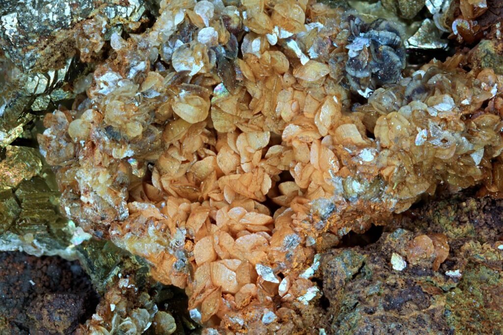Well formed pyrite crystals with triangular faces and orange bladed siderite. Boxed Thumbnail. Ex Brian Davis Collection. Ex Frank Robinson (2007). Frank Robinson Cat No 1446.