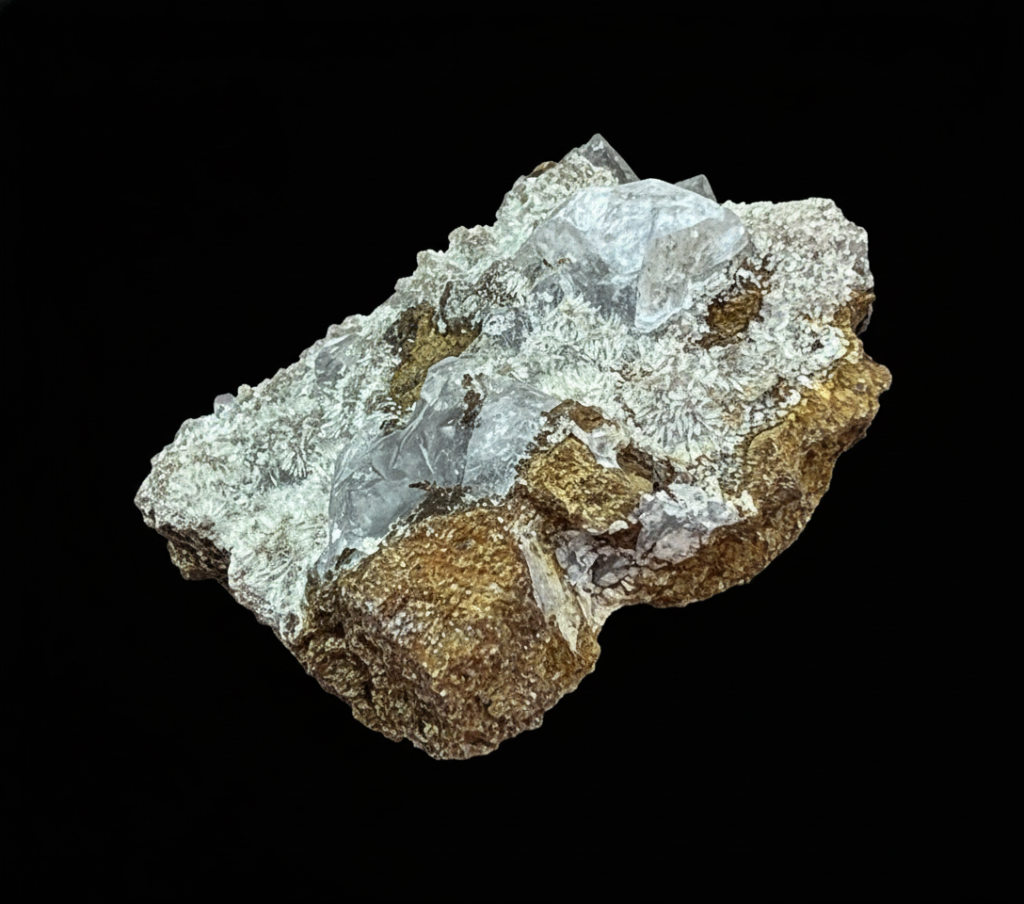 Grey chabazite crystals (phacolite habit) to 9mm with natrolite and thomsonite. Boxed Thumbnail. Ex Brian Davis Collection. Ex Joan Lamond (2008).