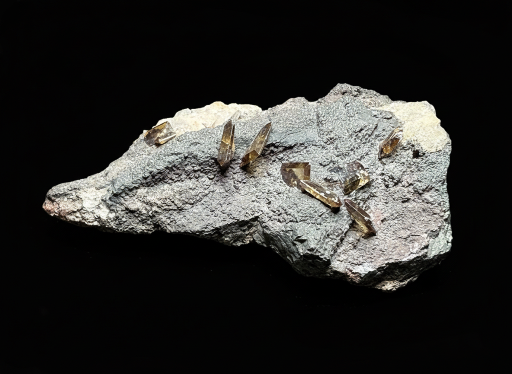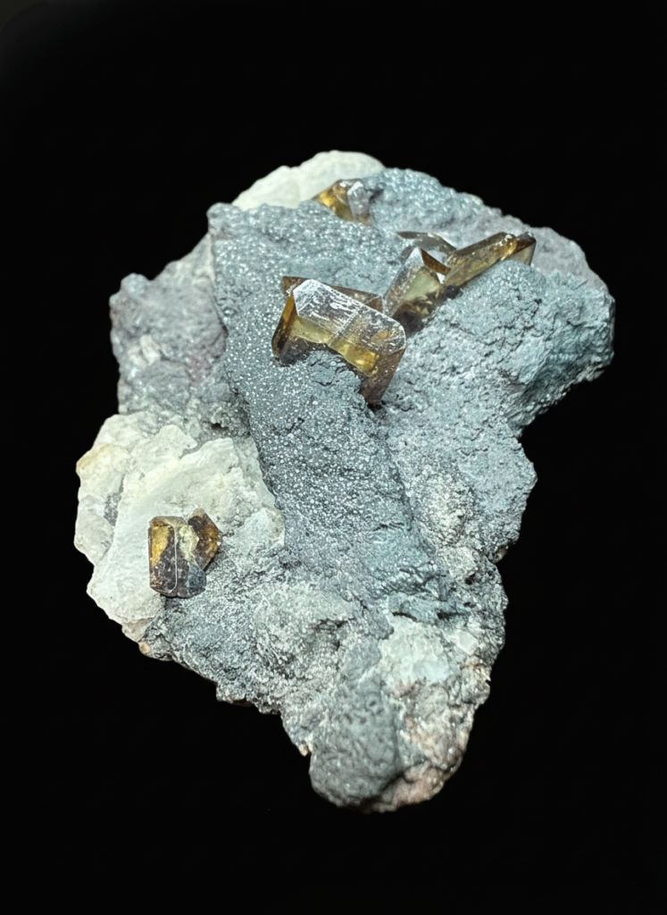 Dark honey coloured wulfenite crystals on a tennantite matrix. Measures 63x30x15mm. Originally sold by Pricedown Minerals for 120 pounds (GBP). Ex Joseph Lhoest Collection. Ex Glenn Davidson Collection. Ex Lehigh Minerals.