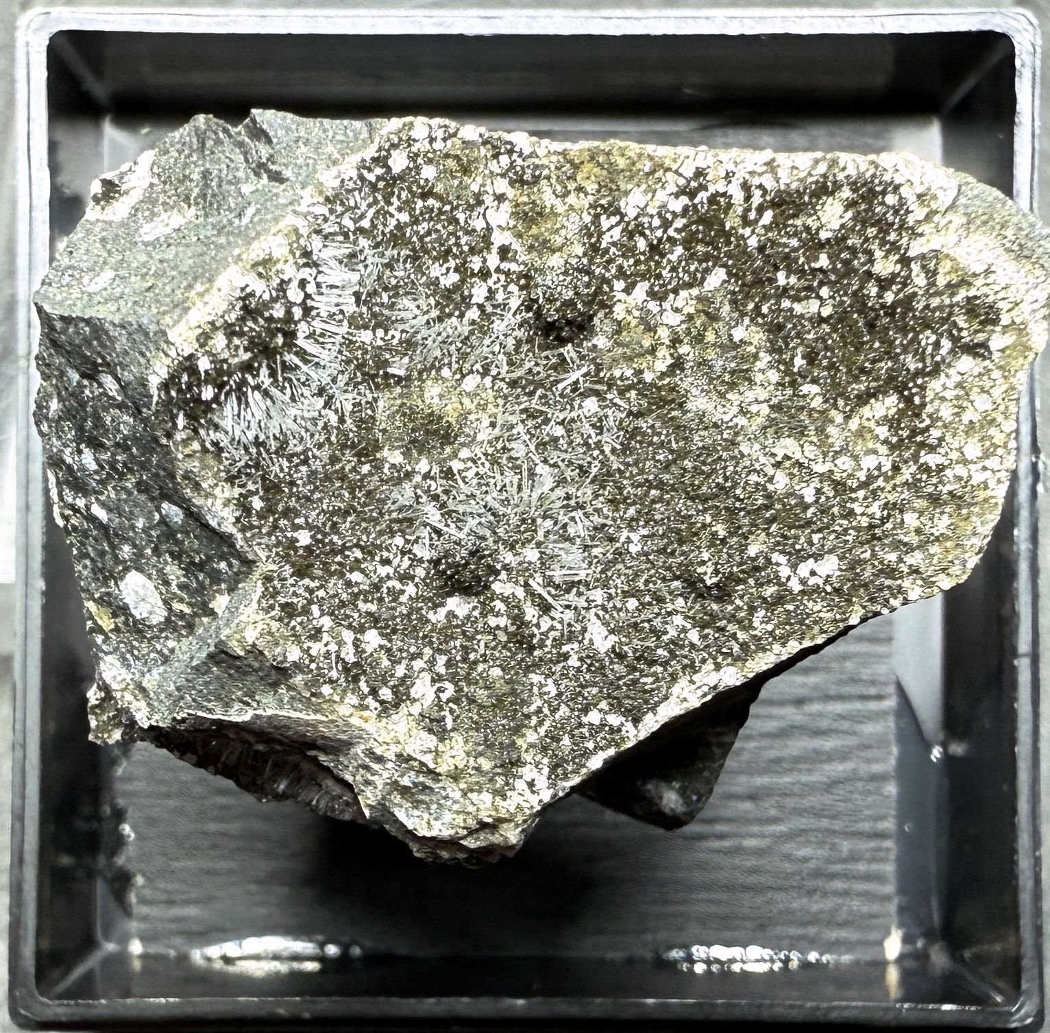 Price $1 Prismatic natrolite with tiny phillipsite crystals and brownish-black nontronite (as labelled). Boxed Thumbnail. Ex Brian Davis Collection. Ex Frank Robinson (2007). Ex Joan Lamond (1991).